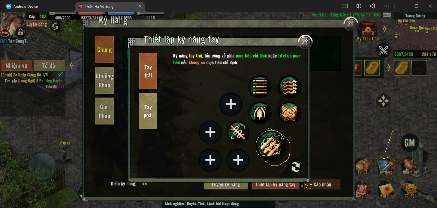 – Kỹ năng → Thiết lập kỹ năng tay → Tay trái.